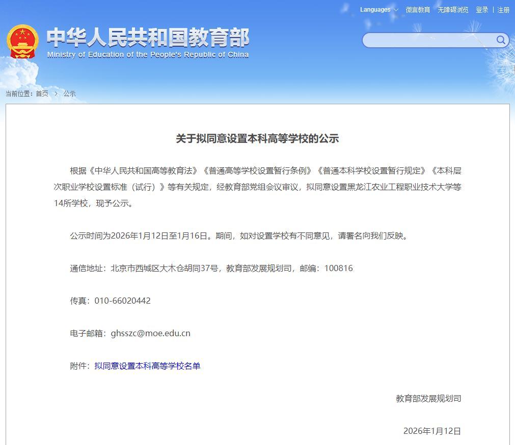 for (var i = 0,len = adKeys.length; i 1月12日,教育部發展規劃司發布《關于擬同意設置本科高等學校的公示》。 公示稱,根據《中華人民共和國高等教育法》《普通高等學校設置暫行條例》《普通本科學校設置暫行規定》《本科層次職業學校設置標準(試行)》等有關規定,經教育部黨組會議審議,擬同意設置黑龍江農業工程職業技術大學等14所學校,現予公示。公示時間為2026年1月12日至1月16日。 此次公示的擬同意設置本科高等學校名單中,包括“榆林學院更名榆林大學”。 榆林學院是一所以工學、農學、社會學科為主,工、管、文、理、農、法等學科協調發展的省屬本科院校,是榆林市唯一省屬本科院校。 據榆林學院官網介紹,學校從綏德師范走來,辦學歷史可追溯至1923年創建的陜西省立第四師范學校。2003年經教育部批準升格為本科院校,2018年被陜西省確定為一流應用型本科院校建設單位,被國務院學位委員會確定為碩士學位授權單位。 學校現有榆陽、綏德師范和科創新城三個校區,產權占地面積1518.87畝,校舍建筑產權登記面積50.38萬平方米,設有16個二級學院,54個本科專業(含2個中外合作辦學項目),現有全日制在校生14616人,其中全日制本科生13569人,碩士研究生988人,學歷教育留學生59人。與西北農林科技大學、西北大學、延安大學等累計聯合培養研究生479人。學校現有教職員工1223人,專任教師957人。專任教師中具有碩士及以上學位者859人,具有高級專業技術職務者577人,具有博士學位者360人。 來源:教育部 榆林學院網站 中國教育在線