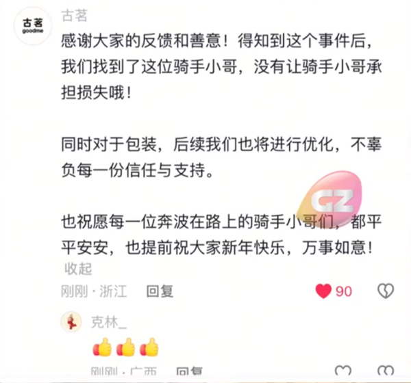 for (var i = 0,len = adKeys.length; i 原標(biāo)題:外賣(mài)小哥打翻32杯奶茶原地發(fā)愣 品牌方回應(yīng):會(huì)優(yōu)化包裝 “外賣(mài)小哥32杯奶茶全灑,古茗暖心承擔(dān)損失并優(yōu)化包裝,還補(bǔ)了配送費(fèi)。這場(chǎng)意外因‘30億請(qǐng)客計(jì)劃’的奶茶狂歡而起,卻以善意收?qǐng)觯瑴嘏苏麄€(gè)寒冬。” 快科技2月8日消息,據(jù)媒體報(bào)道,近日不少網(wǎng)友刷到一個(gè)外賣(mài)小哥的餐損視頻,引發(fā)網(wǎng)友熱議。 視頻中,裝奶茶的紙箱倒在地上,多杯古茗奶茶從紙箱中摔出,外賣(mài)小哥顯得無(wú)奈又沮喪。 今日,古茗奶茶的工作人員表示,當(dāng)時(shí)外賣(mài)小哥配送了32杯奶茶,結(jié)果全灑了。 后來(lái)小哥回門(mén)店決定重新訂購(gòu),門(mén)店工作人員了解情況后,幫他用更便宜的方式下了單。 再后來(lái)公司了解情況后,幫外賣(mài)小哥承擔(dān)下了這批飲品的費(fèi)用,而且也給外賣(mài)小哥補(bǔ)了配送費(fèi),目前事情已經(jīng)圓滿結(jié)束。 古茗官方也通過(guò)社交賬號(hào)回應(yīng)稱(chēng),得知這起事件后,已找到了這位騎手小哥,沒(méi)有讓騎手小哥承擔(dān)損失。同時(shí)對(duì)于包裝,后續(xù)也將進(jìn)行優(yōu)化。 據(jù)悉,近日一場(chǎng)由千問(wèn)發(fā)起的“30億請(qǐng)客計(jì)劃”引發(fā)了一場(chǎng)奶茶消費(fèi)狂歡。 有網(wǎng)友表示,不少奶茶店爆單,有門(mén)店排隊(duì)超500杯,需等3個(gè)小時(shí)。