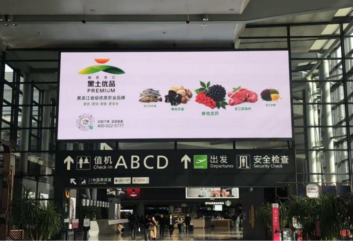 在上海虹橋國際機(jī)場出發(fā)與到達(dá)區(qū)域,“黑土優(yōu)品”采取LED大屏與LCD電子屏組合投放模式,循環(huán)播放呈現(xiàn)黑龍江大米、雜糧、木耳等優(yōu)質(zhì)農(nóng)產(chǎn)品的宣傳片。南航貴賓廳內(nèi),多組LCD屏同步呈現(xiàn),實(shí)現(xiàn)了滿目“黑土優(yōu)品”的視覺效果。