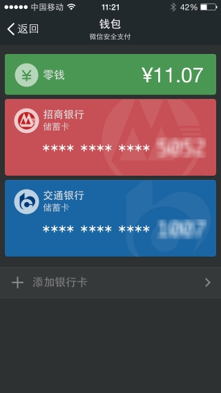 除了“轉賬”功能外,新版微信還將推出推出“錢包”功能。“錢包”功能更由“我的銀行卡”拓展而來,不同的是,在“錢包”中增加了“零錢”功能。