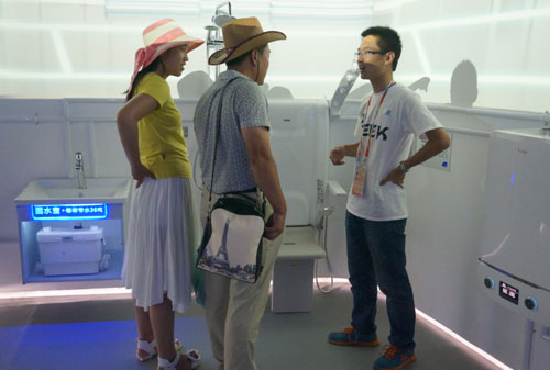 說海爾館細致貼心的服務在世園會已經小有名氣,但更讓游客們驚喜的是館內展出的家電前衛和智慧。在智慧用水展區體驗的張先生說到,“這里展示的產品太厲害了,我第一次看到這個座式浴椅,坐著洗澡既方便又安全,尤其是對老年人來說非常適用。還有這個熱隨人動的設計,確實是節能。智慧采暖爐和熱水器連接在一起,晴天可以使用太陽能,陰天可以自動開啟鍋爐燒水,節電減排!”