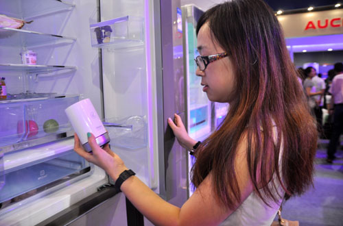 海爾發布的這款冰箱健康盒子,是一個智能平臺級產品,可根據不同容積的冰箱選擇不同殺菌凈化方式,適用于各種類型的普通冰箱。這一智能網器不僅可以探測冰箱內的異味和細菌濃度,直接將檢測到的信息傳輸到手機客戶端,而且可以遠程控制殺菌除味。“這么小小的一個‘杯子’就能又殺菌又除味,真是太方便了!”王女士聽了介紹,反復體驗冰箱盒子,并與工作人員確認什么時候可以購買。