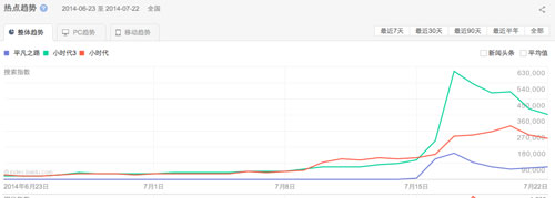 7 月16日,《小時代3》上映前日,闊別歌壇十年的樸樹為《后會無期》帶來了新歌《平凡之路》,這是一次絕對的高概念宣傳,僅樸樹這個符號就足以引爆各個音樂網站、娛樂頭條,對于《小時代3》而言是一次有足夠威力的騷擾:以平凡之路、小時代、小時代3為三個關鍵詞進行百度指數的搜索,結果如下: