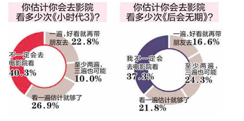 7 月中旬《南方都市報》聯(lián)合手機騰訊網(wǎng)做了一個有關(guān)《小時代3》與《后會無期》的調(diào)查,統(tǒng)計樣本為10000人。根據(jù)統(tǒng)計結(jié)果,在“更關(guān)注《小時代3》”的受訪者中選擇會至少看2-3遍的觀眾占了10%,相對的在“更關(guān)注《后會無期》”的受訪者中選擇此項的觀眾占了24.3%,雖然嚴格意義上,“更關(guān)注《小時代3》”或“更關(guān)注《后會無期》”的受訪者不代表就是郭敬明或是韓寒的粉絲,但是會在沒有看到該片的時候就有如此強烈的愿望為“新片”計劃看2-3遍, 應是兩片各自導演的粉絲無虞了,因此,從這個調(diào)查樣本中可以預見在韓寒的粉絲中或許會有較郭敬明更多的粉絲去通過高頻率觀影幫助偶像刷票房。