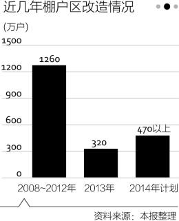 從實際進度來看,要達成這一目標仍有較大難度。官方數據顯示,2008~2012年已改造各類棚戶區1260萬戶,2013年改造320萬戶,2014年計劃改造470萬戶以上。由此可計算,政府7年內改造各類棚戶區2050萬套,約合每年300萬套,與目標值有一定差距。