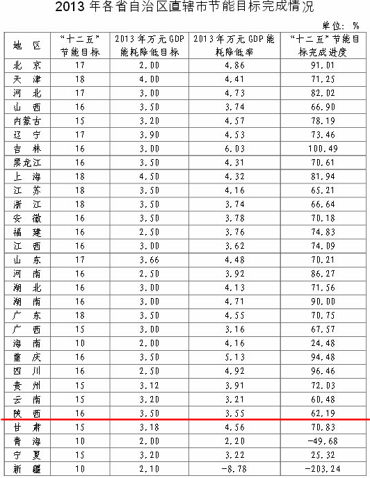近日,國家發(fā)展和改革委員會發(fā)布全國各地區(qū)2013年度節(jié)能和控制能源消費(fèi)總量目標(biāo)完成情況、措施落實(shí)情況的考核結(jié)果。2013年,陜西萬元GDP能耗降低率為3.55%,順利完成目標(biāo)任務(wù);但從“十二五”節(jié)能目標(biāo)來看,完成進(jìn)度僅為62.19%,居全國倒數(shù)第六位。