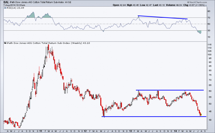 iPath Cotton ETF (BAL) 指數已從2014年高點跌去30%,并跌破2012年觸及的42美元低位。國際棉花期貨價格自2011年紀錄高點下挫近60%,當前仍在2012年創下的歷史谷底之上。