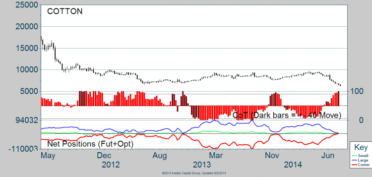 不過,每隔一段時間,商業交易者也會接近或完全持有商品凈多頭頭寸。當發生這種現象的時候,通常隨后都會發生趨勢變化。這也正是棉花市場當前正在發生的事,并且還發生在過去七年的某些時候。在商業交易者變身棉花凈多頭之際,那些通常持有棉花凈多頭頭寸的大型交易者則持有凈空頭。這種情況在去年晚些時候曾經出現。隨后,國際棉價在數月內持續反彈。