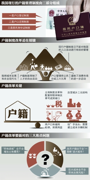今年的全國兩會上,全國政協委員、環境保護部副部長吳曉青建議,推進新型城鎮化應統籌推進戶籍制度改革,適時制定出臺戶籍法,統籌解決城市常住人口的教育、就業、醫療、住房等問題。