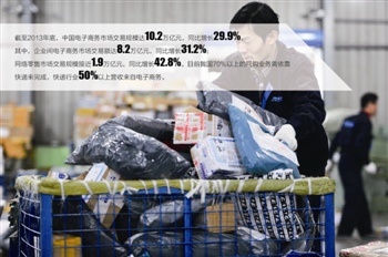 事實上,快遞與電商已經在潛移默化中成為了密不可分的利益共同體。快遞服務規模擴張得益于近年來電子商務的井噴式增長。數據顯示,截至2013年底,中國電子商務市場交易規模達10.2萬億元,同比增長29.9%,其中,企業間電子商務市場交易額達8.2萬億元,同比增長31.2%;網絡零售市場交易規模接近1.9萬億元,同比增長42.8%。