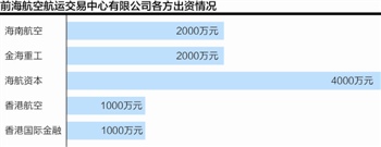 今年1月4日,海航航空(600221)發(fā)布公告稱,公司擬與海航集團旗下的海航資本控股有限公司(下稱“海航資本”)、金海重工股份有限公司(下稱“金海重工”)、香港航空有限公司(下稱“香港航空”)、香港國際金融服務集團有限公司(下稱“香港國際金融”)共同投資1億元組建前海航空航運交易中心有限公司。其中,海南航空與金海重工各出資2000萬元,海航資本出資4000萬元、香港航空及香港國際金融各出資1000萬。出資方均為海航集團旗下企業(yè),其中海航資本為海航業(yè)務板塊中資本運作的核心平臺,主營企業(yè)資產重組、并購及項目策劃等;海南航空則是海航旗下航空板塊的上市平臺;金海重工是海航物流板塊重要平臺;香港航空是其與國際航空接軌的橋梁,香港國際金融則是其在海外的綜合性金融服務供應商。