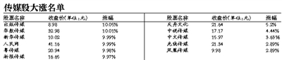 傳媒股再現漲停潮。人民網、粵傳媒、浙報傳媒連續兩日漲停,與此同時出版傳媒、華數傳媒、新華傳媒昨日也封死漲停板。數據稱傳媒板塊漲幅超3%。