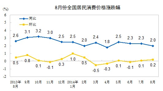 今日,國家統計局公布數據顯示,2014年8月份,全國居民消費價格總水平同比上漲2.0%。其中,城市上漲2.0%,農村上漲1.9%;食品價格上漲3.0%,非食品價格上漲1.5%;消費品價格上漲1.8%,服務價格上漲2.4%。1-8月平均,全國居民消費價格總水平比去年同期上漲2.2%。