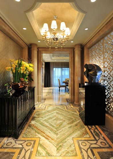 編輯點評:走廊式的玄關采用金黃色為主色,大理石鋪面傳達出高冷氣息,窗欞設計體現出現代東方氣韻,吊頂的設計使整個玄關空間更顯華麗。