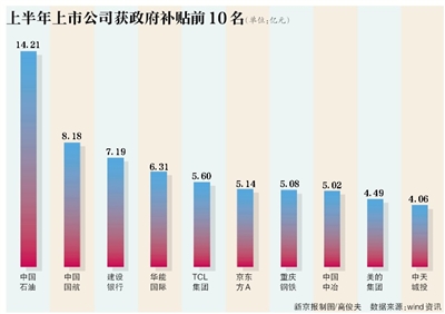 然而,另一組數(shù)據(jù)暴露了這份成績(jī)單背后的水分。上半年共有2235家上市公司收到政府補(bǔ)貼,占比達(dá)88.1%,合計(jì)補(bǔ)貼金額高達(dá)322.63億元,較上年同期增加逾三分之一。上述320多億元補(bǔ)貼中,有一半流向58家上市公司。獲補(bǔ)貼金額排名前十位的企業(yè)中,有7家為央企和地方國(guó)企。
