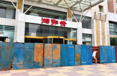 2014年9月25日,湘鄂情北四環店由于租約未談攏與物業發生沖突,物業方在店門口搭起了圍擋。新京報記者 浦峰攝