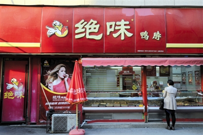 在北京朝陽區勁松路與勁松中街相交處的東南角有一家絕味鴨脖店。這間約10平米的一層平房,夾在兩家服裝店中間。屋頂邊沿立著一個紅色的標牌:一只黃白相間的卡通鴨子,兩個大字“絕味”旁邊,是較小的“鴨脖”兩個字;右下角寫著加盟電話。標牌顯示,這是勁松二店。