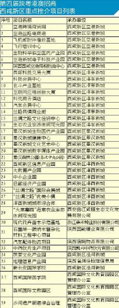 西咸新區將向粵港澳拋出誠意十足的“橄欖枝”。此次西咸新區推出77個項目,項目涵蓋農林牧、能源化工冶金、裝備制造、輕紡食品醫藥、高新技術、城建及交通、節能環保、物流商貿、文化旅游及產權交易10大類別。其中,重點推介的項目有:空港新城的陜西西咸空港保稅物流中心、飛機部附件維修基地,灃東新城的北斗產業基地和絲路風情商業街項目,秦漢新城的健康中心、數字媒體產業園和秦漢森林公園,灃西新城的西咸新區信息產業園、大數據產業園和中小企業園和總部經濟產業園,涇河新城的石墨烯-碳納米管雜化材料工程中心、汽車配件物流項目,以及西咸國際文化教育園、西咸國際醫學院、絲路經濟帶能源金融貿易區等。