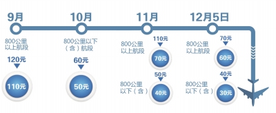 據記者了解,天津航空、廈門航空、海南航空已先后發出通知,自12月5日(出票日期)起,國內航線燃油附加費征收標準調整為:800公里(含)以下航段每位旅客燃油附加費由40元調整為30元,800公里以上航段每位旅客燃油附加費由70元調整為60元。這已是今年9月以來,國內航線燃油附加費第四次下調(詳見上圖)。