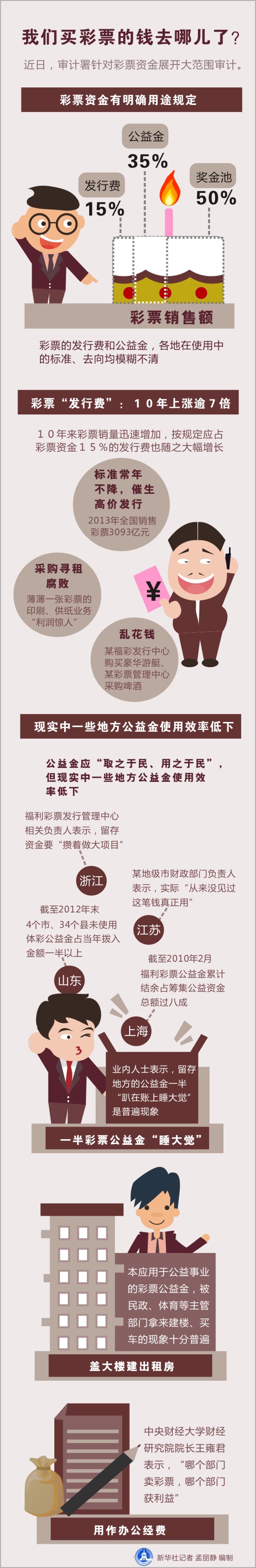 彩票資金是以抽簽有獎方式籌集的社會公益金,理應“取之于民、用之于民”。而“新華視點”記者調查發現,對彩票的發行費和公益金,各地在使用中存在巨大差異,標準、去向均模糊不清。一方面,發行費標準多年居高不下;另一方面,有大量公益資金趴在地方政府賬上“睡大覺”,還有部分公益資金被用于蓋大樓、買游艇、補虧空。