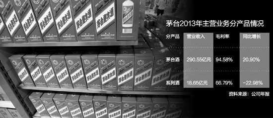 “系列酒的運(yùn)營(yíng)多年來(lái)都不溫不火。從前系列酒的定位是以培育醬香型白酒消費(fèi)群體為主,現(xiàn)在市場(chǎng)變了,未來(lái)系列酒將被定位成貴州茅臺(tái)一個(gè)新的經(jīng)濟(jì)增長(zhǎng)點(diǎn)。”上述內(nèi)部人士向記者表示,“從前沒(méi)有重點(diǎn)做系列酒是因?yàn)楫a(chǎn)能不足,加上培養(yǎng)一個(gè)熟手工人就要5個(gè)月時(shí)間,現(xiàn)在大環(huán)境變化了,現(xiàn)行的系列酒銷售運(yùn)作體制已經(jīng)不適應(yīng)市場(chǎng)的變化。”茅臺(tái)系列酒以四醬為代表,包括了漢醬酒、仁酒、茅臺(tái)王子酒、茅臺(tái)迎賓等中低端產(chǎn)品,2013年年報(bào)顯示,系列酒銷售額為18.65億元,僅占整體銷售額的6%,毛利率也遠(yuǎn)遠(yuǎn)低于茅臺(tái)酒。