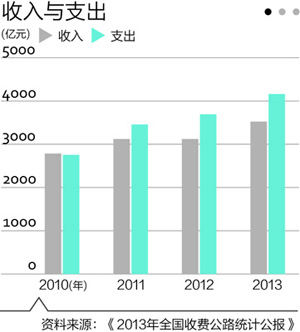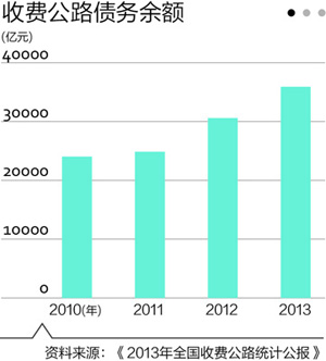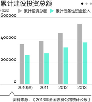 交通部數據顯示,2010年到2013年,全國收費公路累計建設投資總額由36506億元增加到54432億元;債務余額由22912億元增加到34308億元。