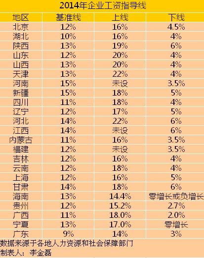 據(jù)中新網(wǎng)記者不完全統(tǒng)計,今年全國已有北京、天津、上海、廣東等23個省(區(qū)、市)發(fā)布了2014年企業(yè)工資指導(dǎo)線。企業(yè)工資指導(dǎo)線由基準(zhǔn)線、上線和下線構(gòu)成,是給當(dāng)?shù)仄髽I(yè)合理確定工資增長水平的參考依據(jù),但并不具有強制性。