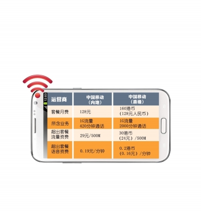 內地香港流量資費相當中國移動在內地的“4G上網套餐”中,含1G流量的套餐月資費為128元;而中國移動在香港的同檔位套餐分為兩種資費,以資費最低的24個月合約計算,中國移動香港套餐的月資費為160港幣,折合人民幣也是128元。