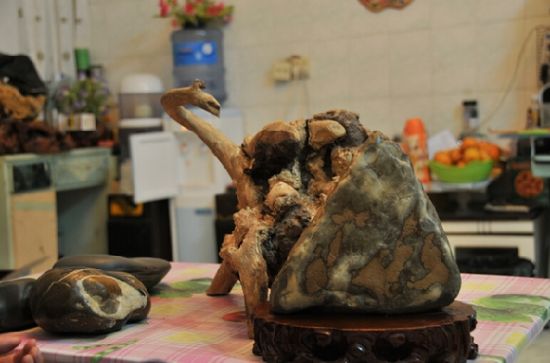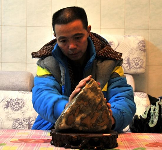 張舜出生在桂、滇、黔三省(區)交界處的一個農村家庭里,家鄉的母親河——南盤江邊上,自古就有著大片大片的沙灘,沙灘上五顏六色、形狀各異的石子,從小就是他最好的玩伴。由于對石子有特殊的感情,加之收藏的奇石常常得到同事和朋友們的夸贊,張舜收藏奇石的心便一發而不可收。特別是2006年他的另一個愛好“養蘭花”在市場中失寵后,他便專心四處找尋著心儀的石頭。每到周末、節假日,如果不能外出找石頭,他便混身難受。南盤江、馱娘江、西洋江的每一個沙灘都留下了他的足跡,他曾多次到云南曲靖市的五龍河和鳳凰谷撿過石頭,也到過貴州的馬嶺河和安順河淘過“寶”。他說,他從各地撿來的石頭已擺滿了屋內,也堆滿了屋頂,應該有10噸重了。