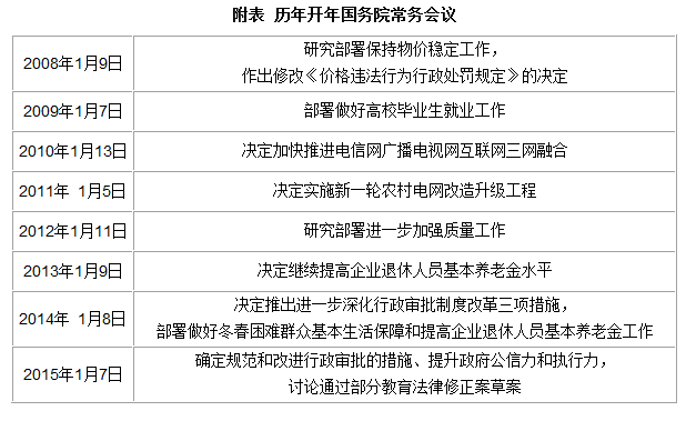 從政務日歷不難發現,本屆政府上任首次常務會議主要議題就是推進機構改革、簡政放權,2014年和2015年的首次常務會議主要議題都包含了這一議題。