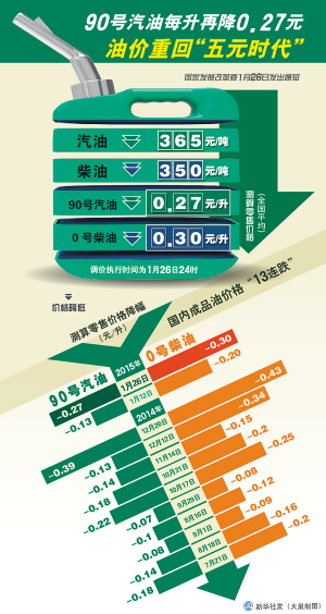 國家發展改革委通知,自2015年1月26日24時起降低國內成品油價格。汽、柴油(標準品)供應及零售價格每噸分別降低365元和350元。
