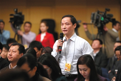 新京報記者涂重航提問關于公務員職務職級并行改革措施的問題。(新京報記者 薛珺 攝)