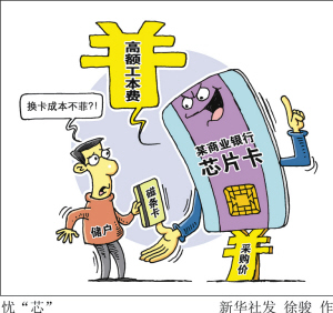 然而,記者調查發現,盡管相關政策明令銀行“減負”,但對于儲戶來說,辦理或換用銀行芯片卡卻成本不菲:首先,薄薄一張芯片卡的采購價僅8元多,但國有大銀行對儲戶最多竟收四五十元的“工本費”;同時,以“換芯”為名,已被叫停的多種違規收費“改頭換面”。從不提示就收錢到“捆綁辦卡”,新一輪收費亂象頻出。