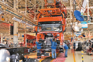 陜西汽車控股集團有限公司總裝廠車間內(nèi),工人正在裝配卡車(資料圖片) 記者 李念 攝