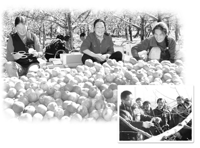 上圖果農(nóng)在地頭分揀蘋果,享受豐收的喜悅。右圖農(nóng)技人員對(duì)果農(nóng)進(jìn)行示范培訓(xùn)。