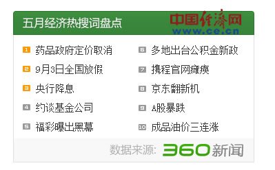 “月度經(jīng)濟熱詞”由中國經(jīng)濟網(wǎng)與360新聞聯(lián)合推出,按網(wǎng)絡(luò)搜索頻率排出,是對過去一個月經(jīng)濟熱點的回顧。