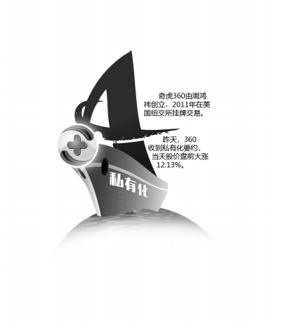 京華時報 制圖 何將 原標題:奇虎360啟動私有化 京華時報訊(記者 古曉宇)又一家重量級中概股選擇了退市之路。昨天晚間,奇虎360公司宣布,公司董事會已接到初步非約束性私有化要約,該公司董事長周鴻