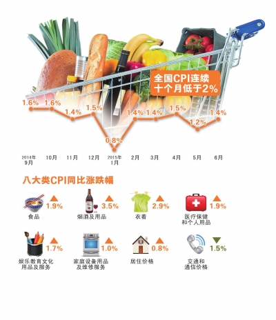 昨天,國家統計局發布的數據顯示,6月全國居民消費價格指數(CPI)同比上漲1.4%,漲幅較5月擴大0.2個百分點。至此,全國CPI同比漲幅已經連續5個月處于“1時代”,也連續10個月低于2%。