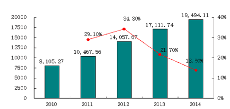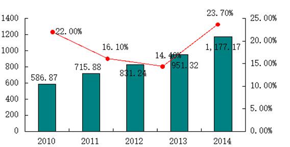 2014年,本行業利潤總額高達1,177.17億元,利潤總額系近年來最高,同2013年(14.4%)低點相比,其增長率創近年新高,達到23.7%。