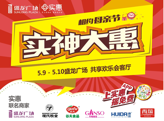 母親節什么樣的慶祝方式最特別?各種打折已不稀奇,免費吃喝拿送才給力!母愛暖暖,福利滿滿,5月9日-5月10日,由實惠APP發起的“實神大惠”母親節主題活動將在龍首村盛龍廣場盛大開啟!