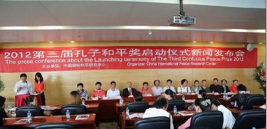 9月9日下午15時,由中國國際和平研究中心主辦的2012年第三屆孔子和平獎啟動儀式新聞發布會在清華大學科技園國際會議中心隆重舉行。