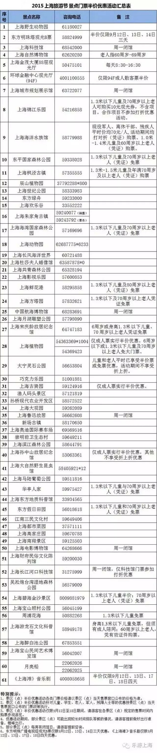 優惠時間是9月12日—9月18日,全市將有61家景區(點)及演出參與其中,詳情見圖。(新民晚報 新民網 胡彥珣)