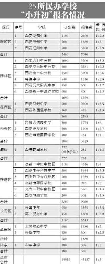 今日9時,45137名學生將參加2013年西安民辦學校“小升初”綜合素質測評。昨日,西安市教育局召開新聞通氣會,公布招錄情況。 今年全市符合參加5·26綜合素質測評的學校涉及9個區縣26所民辦學校,比