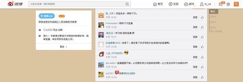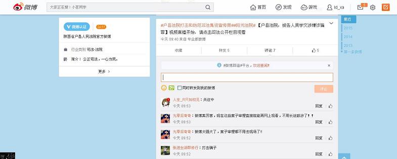 同日,戶縣法院官方微博直播的被告人吳學文詐騙一案的庭審和宣判,閻良法院官方微博直播的原告西安市閻良區昊信商業運營管理有限公司訴被告西安嘉華房地產開發集團有限公司商品房買賣合同糾紛一案,也得到了網友們的肯定:“微博太強大了,案子審理都不用去現場了!”,“直播畫面不錯,以后要經常公開庭審現場啊,讓大家多多學習法律知識!”