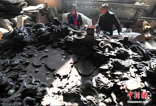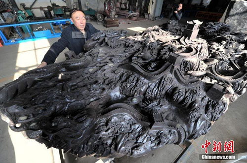 12月2日,河北硯臺收藏者張晶廷正展示一個巨型硯臺。該“大好河山硯”長約6米,重約18噸,整體橢圓形,紫紅色表面雕刻著56條大小不同、姿態各異的中國龍,與蜿蜒的長城交錯有致。